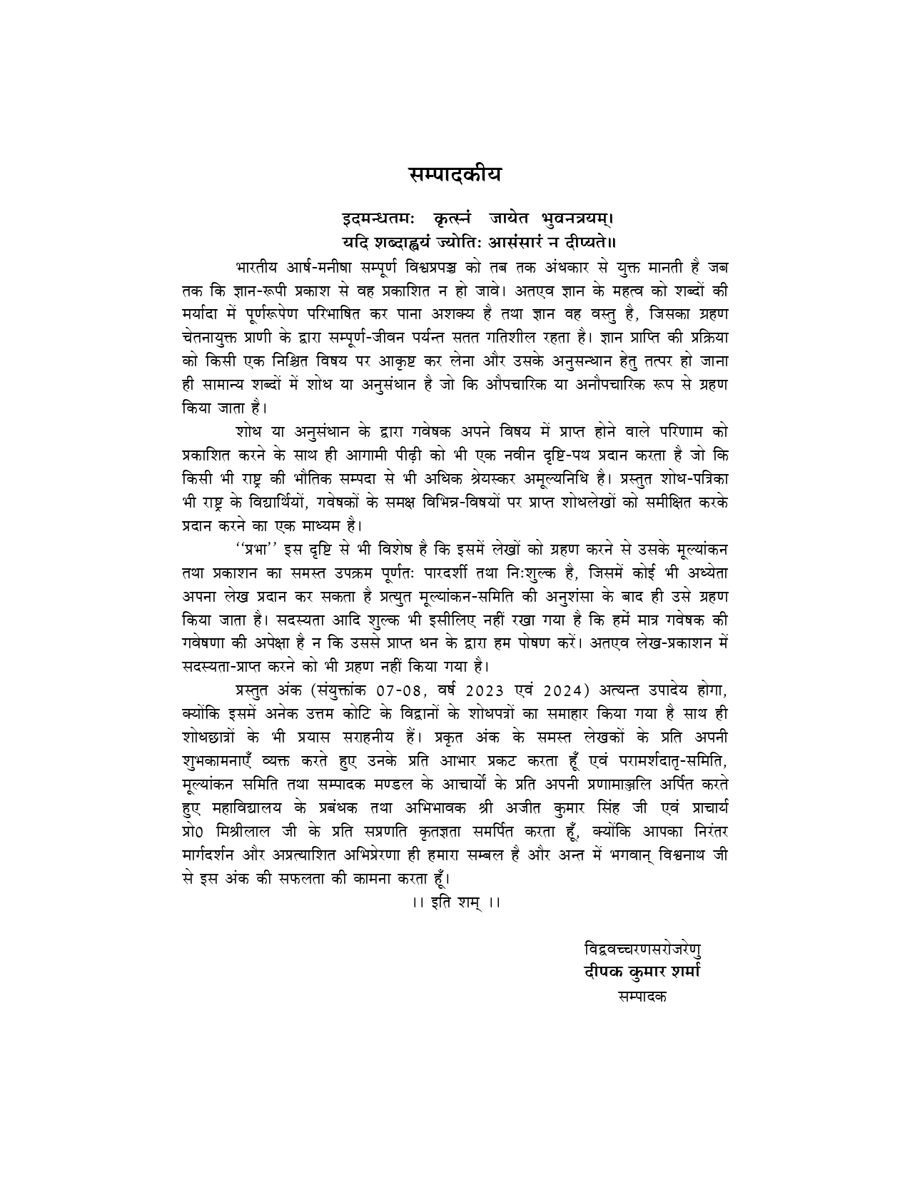 सृष्टि के आरम्भ से ही जीवमात्र का स्वाभाविक धर्म है सुखानुभूति, जिसे प्राप्त करने के लिए वह निरंतर अपनी तार्किक क्षमताओं, बौद्धिक प्रतिभाओं तथा शारीरिक श्रम के आधार पर प्रयत्नशील रहता है । शोध अथवा अनुसंधान का भी प्रादुर्भाव नवीन सिद्धांतों का अन्वेषण और उससे होने वाले लाभ को दृष्टिगत करके ही हुआ है ! वस्तुतःशोध भी मानवमात्र का स्वाभाविक धर्म ही है क्योंकि प्रत्येक मनुष्य अपने दैनंदिन क्रियाकलापों का प्रयोग तथा उसके लाभ-हानि का मूल्यांकन करके उसे ग्राह्य अथवा निषिद्ध के रूप में परिभाषित करता है । शिक्षा का प्रमुख उद्देश्य बालक के सर्वांगीण विकास के द्वारा स्वस्थ,समृद्ध,एवं संपन्न समाज का निर्माण करना है। शैक्षणिक संस्थान इसके आधार होते हैं इन संस्थानों का उत्तरदायित्व है कि वो अध्येताओं में शोध प्रवृत्ति की वृद्धि करते हुए नवीन अनुसंधान हेतु मार्गदर्शन करें । डी.ए.वी.पी.जी.कॉलेज के द्वारा अपने शोध अध्येताओं,आचार्यों तथा अन्य शैक्षणिक संस्थानों के द्वारा किये जा रहे शोध को समाज में प्रसारित करने तथा आगामी पीढी के मन में अनुसंधान के प्रति रुचि उत्पादन के उद्देश्य से प्रभा नामक शोध पत्रिका का प्रकाशन किया जाता है यह शोध पत्रिका बहुविषयक तथा बहुभाषायी समीक्षित एवं मूल्यांकित है जिसके समीक्षक मंडल,मार्गदर्शक समिति में राष्ट्र के श्रेष्ठ वरेण्य विद्वान् विद्यमान हैं जिनका ज्ञान-प्रवाह हमें निरंतर अभिषिंचित कर रहा है। हमें विश्वास है कि प्रभा अपने उद्देश्यों की पूर्ति करते हुए शोध के क्षेत्र में अपनी संज्ञा ‘प्रभा’ को सार्थक करेगी।